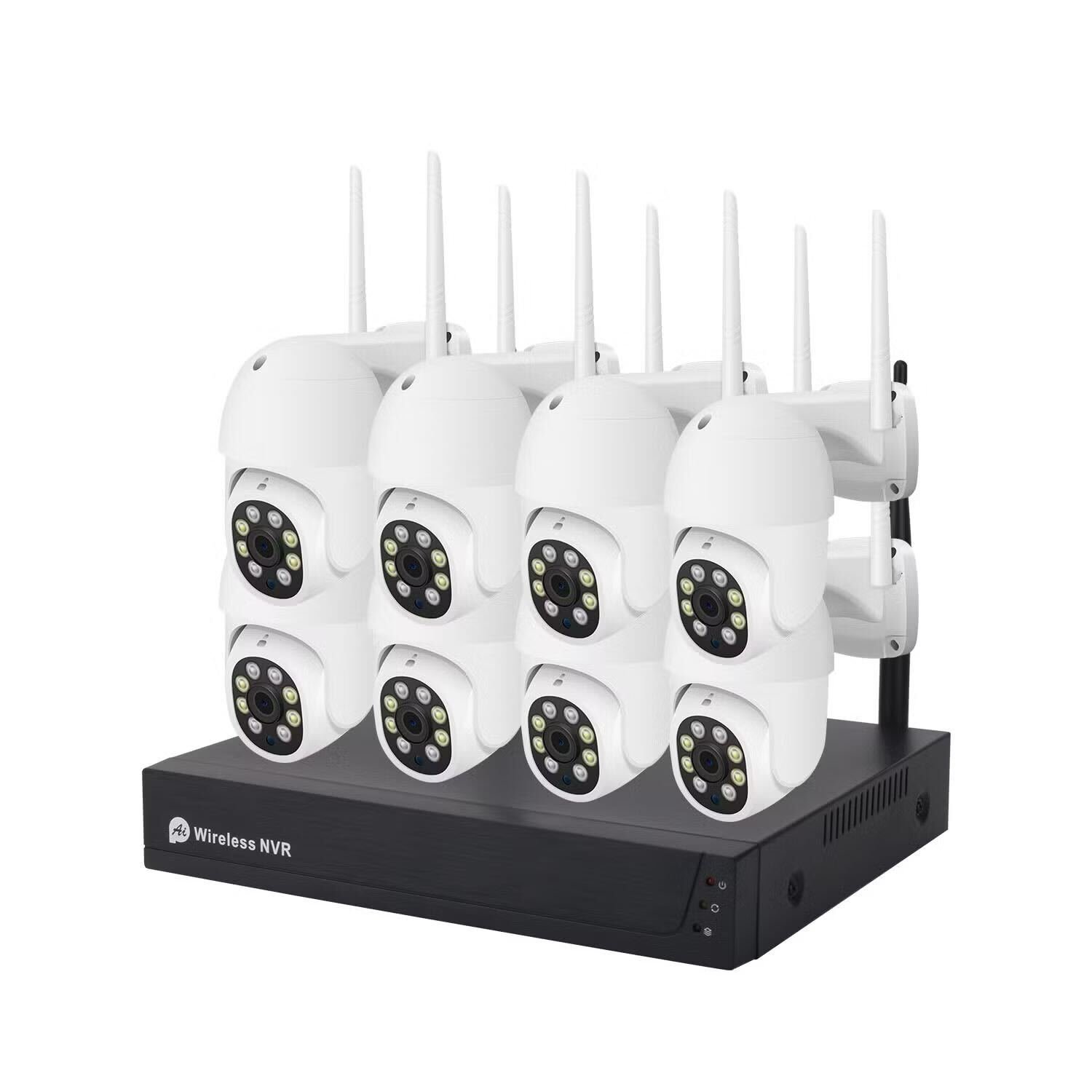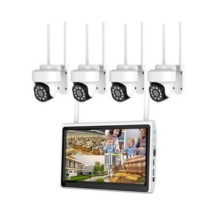 Një sistem sigurie që përmban një regjistrues video pa tel (NVR) dhe tetë kamera pa tel. Kamerat duken të jenë të llojit pan-tilt-zoom (PTZ), me antena të shumta për lidhje pa tel. Njësia NVR, e cila shërben si qendra kryesore e sistemit, ndodhet në bazën e kamerave dhe ka mbishkrimin "Wireless NVR" në të. Sisteme të tilla janë krijuar për instalim të lehtë dhe ofrojnë ruajtje lokale, zbulim të lëvizjes dhe shikim në distancë përmes një aplikacioni celular ose softueri kompjuteri.